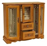 "Elizabeth", Mele Oak finish jewlry box with curved etched glass panels, dual necklace carousels, beaded and burlwood details. Features 2 open drawers, ring rolls behind center door, hand lined with ivory sueded fabric interior,and antiqued brasstone hardware with a scalloped top. 13 1/4" wide, 4 7/8" deep, and 12 1/2" high. Features: Hand lined with ivory sueded fabric interior., Antiqued brasstone hardware with a scalloped top., 13 1/4" wide., 4 7/8" deep., 12 1/2" high.. Read More