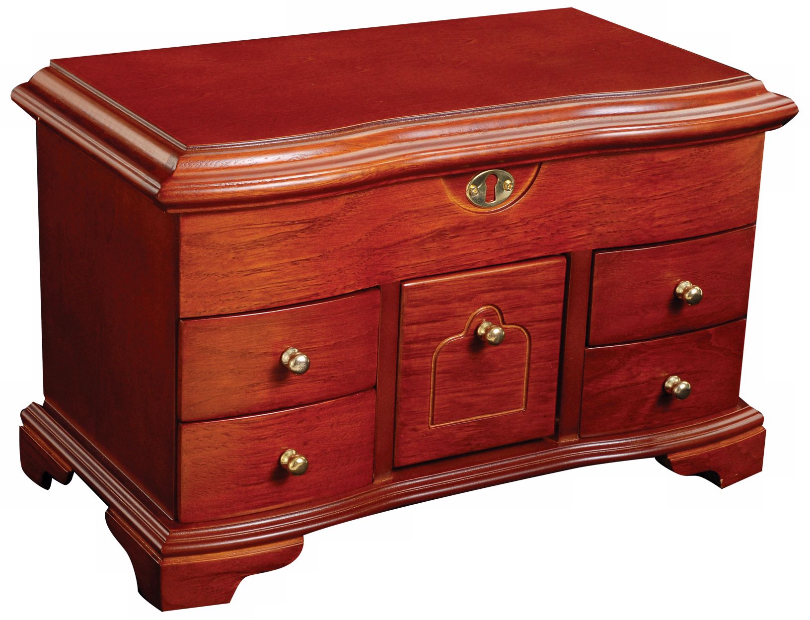 This casual, walnut finished jewelry box from Mele and Co. helps you conveniently store and organize all your jewelry in one place. Lid lifts to reveal a large mirror. The box also contains a hidden necklace drop, five storage compartments, a drop front with ring rolls, and four sliding drawers. Drawers open with goldtone drawer pulls and that match a goldtone faux lock. Interior is hand lined with sand sueded fabric. Walnut finish. Goldtone drawer pulls and faux lock. Lift lid with large mirror. Hand lined, sand sueded fabric interior. 7 3/4" high. 6 1/2" deep. 12 1/2" wide.... Read More